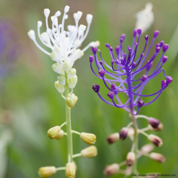 Die Schopfige Traubenhyazinthe (Muscari comosum) mit ihren federartigen Traubenblüten ist eine speziellere und spätblühende Art. Besonders geeignet sind sie für Unterpflanzungen von Laubgehölzen.