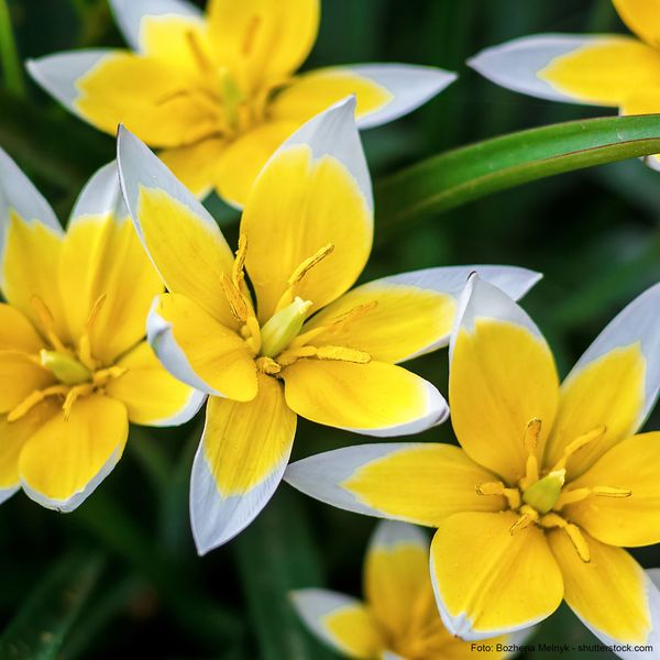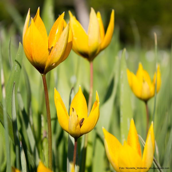 Die sogenannten botanischen Tulpen, auch Wildtulpen genannt, ziehen Bienen magisch an. Im Garten benötigen Sie einen warmen und sonnigen Platz, da die Zwiebeln nach der Blüte kaum Feuchtigkeit vertragen. Die Weinberg- oder Wilde Tulpe (Tulipa sylvestris) blüht goldgelb und duftet süßlich.