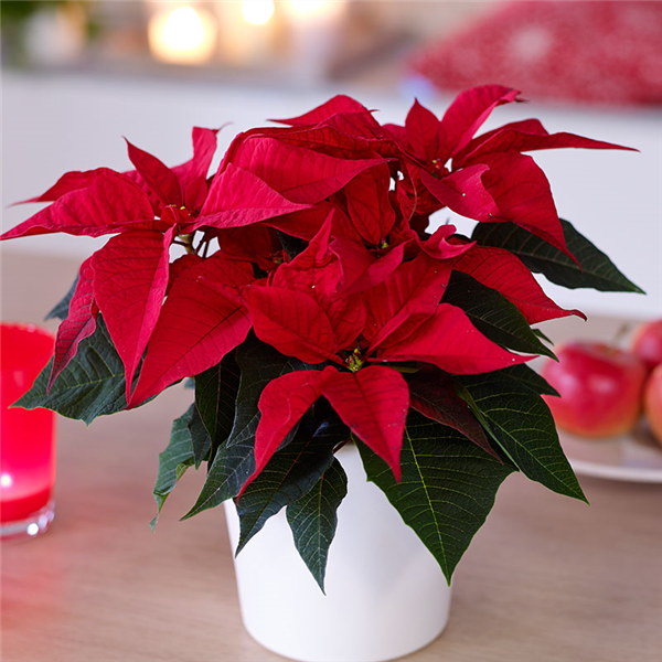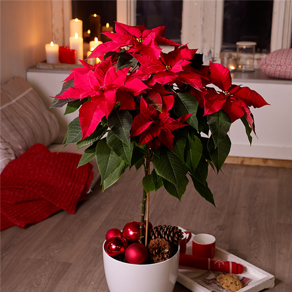 In leuchtendem Weihnachtsrot und zu mehreren Brakteen in einem Topf bringt er ganz deutlich Weihnachten ins Haus, egal ob als Midi-Variante oder als großer Busch. Auch ist er das wohl beliebteste Mitbringsel in der Adventszeit.